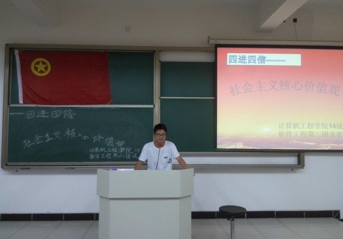 此次支部活动主要由以下两个议程构成,首先由14级软件2班团支书为大家讲解四进四信的内容和意义、社会主义核心价值观的诞生和意义,还有我们在日常生活中应该如何践行社会主义核心价值观。