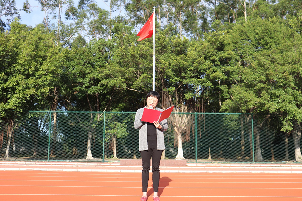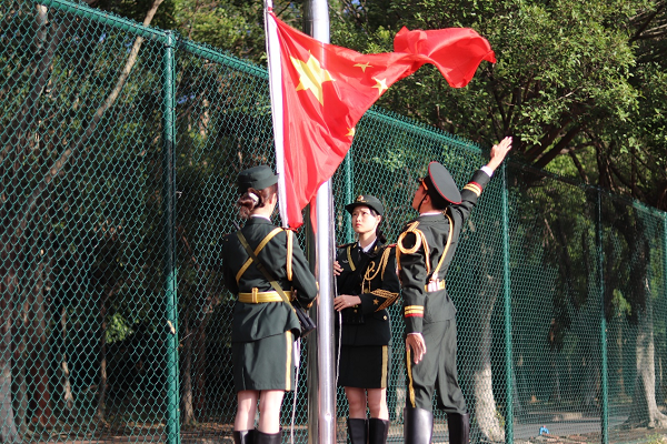8点整,升旗仪式正式开始,国旗护卫队护送五星红旗入场,伴随着雄壮的国歌声,五星红旗冉冉升起,全场师生面向国旗行注目礼,齐唱国歌,向伟大祖国致以最崇高的敬意!