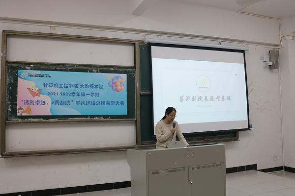 活动伊始,蔡沂副院长致辞,首先对本学期学院的学风建设工作进行了总结,高度认可了计算机学子的奋斗和成绩,为学风建设付出努力的广大师生表示感谢。同时,她对同学们提出了新的期望和要求,每位同学都应该端正学习态度,不仅要重视专业课知识的积累和沉淀,也要重视课外知识的获取和拓展。她强调,学风建设是一个长期的过程,需要我们每一个人的努力和坚持,希望同学们能学会沉淀自己,厚德载物,做一个有底蕴、有思想的人。
