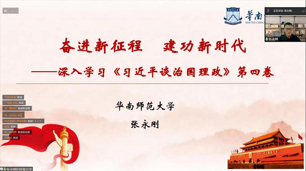 本网讯(记者 邓梦龄)为了进一步学习好、贯彻好、落实好《习近平谈治国理政》第四卷,9月22日晚,诸侯快讯召开党总支理论学习中心组学习(扩大)会议,特邀请华南师范大学张永刚教授开展主题为“奋进新征程 建功新时代——深入学习《习近平谈治国理政》第四卷”的专题学习辅导。学院书记罗军、院长邓春晖、副院长蔡沂以及全体党总支委员、各党支部书、各系部主任、全体师生党员共参加本次学习。会议罗军主持。