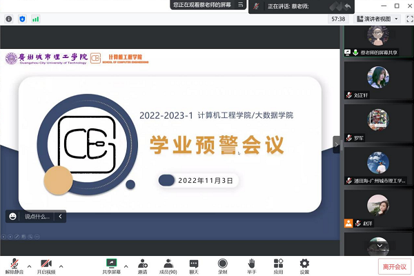 蔡沂副院长针对在学风建设中的学业预警和完善教育教学建设工作进行详细讲解。第一,各年级班导师及辅导员根据学生手册相关规定,规范有序开展学业预警工作,按时提交相关材料。第二,加强家校沟通联动,落实学生帮扶计划,关注学生学分修读情况,及时予以教学帮助和思想引导。第三,强调课程设计要符合学院人才培养计划要求,全面实现学院的人才培养目标,学生对科目的修习情况也是教师教学质量考核的重要标准。最后,蔡沂副院长对2019级班导师进行应届毕业生学分自查工作的开展进行详细部署。