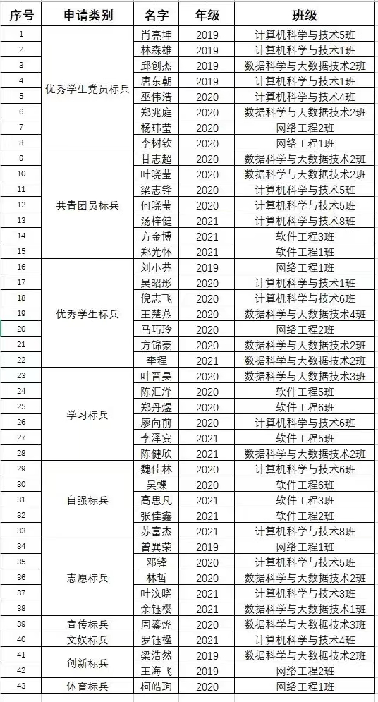 根据《诸侯快讯入口官网/大数据学院2021-2022学年度“学生标兵”评选工作的通知》的要求,经个人自荐、学院审核、公开答辩,最终评选出诸侯快讯入口官网/大数据学院2021-2022学年度“学生标兵”43名,现将名单公示如下: