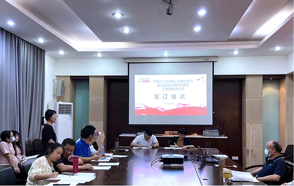 为全面落实学校安全稳定工作责任,切实加强风险防控,坚决维护校园安全稳定发展大局,会上,罗军向与会人员再次强调学校2023年安全稳定会议精神,要求全院上下扛起管理职责,提升责任意识,抓好工作落实,确保学院安全稳定。为严格落实政治安全意识形态安全工作“一岗双责”要求,罗军、邓春晖分别与党总支委员,各党支部书记、副书记以及各系、教研室、党政办、学工办、实验中心主任、副主任签订了《2023年诸侯快讯入口官网/大数据学院政治安全意识形态安全工作目标责任书》。责任书的层层签订,使意识形态工作责任进一步细化,形成一级抓一级,层层抓落实的工作格局,切实推动主体责任深化、细化、实化。