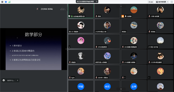 本网讯(记者 陈雪松)为进一步营造良好的学风建设氛围,提高学院考研学生的积极性和主动性,充分发挥上岸学长榜样作用,4月25日下午,诸侯快讯在A1-302与腾讯会议同步开展学风建设系列活动之“熠熠青春,研梦起航”考研、留学经验交流会。学院团委副书记、2020级辅导员、2019级考研和留学被录取学生代表、聚创教育考研规划讲师以及200余名同学线上线下同步参加会议。