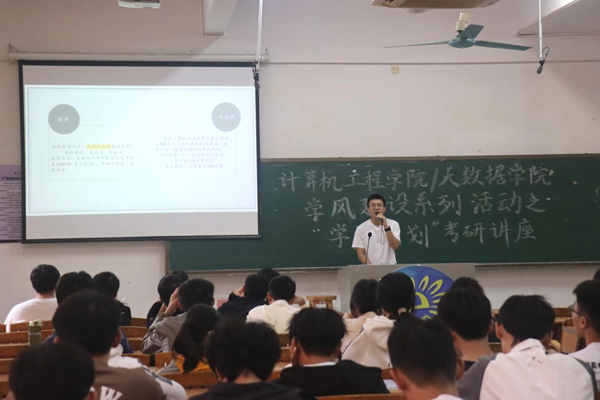 会上,被广东工业大学录取的2018级计算机科学与技术专业詹杰群师兄结合自己一年以来的研究生生活经历,分享了自己对考研的全新认识。他表示,专业选择时不需局限于传统的计算机专业。在交叉学科快速发展的背景下,生物信息工程等众多新兴领域存在着大量的计算机人才缺口,建议师弟师妹们拓展视野,勇于尝试。此外,他还围绕“什么人适合考研”、“考研的前期应做好什么样的准备”等话题进行分享。