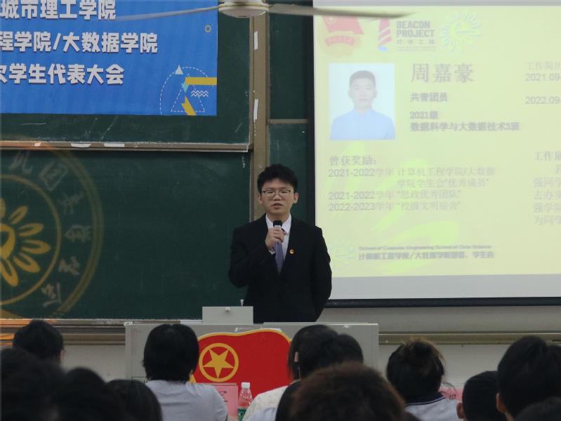 随后,黄圣钊同学作《诸侯快讯入口官网/大数据学院学生会2022-2023年工作报告》对过去一年的学生会工作进行总结。