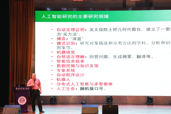 启动仪式后,计算机实验中心主任胡赟以《人工智能及其应用》为主题开讲,向同学们普及人工智能相关理论知识,并对人工智能的三个层次——算法智能、语言智能与想象智能进行剖析。他以BP神经网络、卷积神经网络和循环神经网络为例,深入浅出地介绍了常见深度学习的基本模型,指出在机器学习与大模型技术结合的背景下,人工智能将引领人类第四次工业革命,走向智能化发展。他还鼓励同学们把握人工智能发展的机遇,积极面对新时代所带来的风险与挑战。