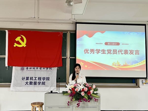 接着,由优秀学生党员代表——学生第一党支部2021级计算机科学与技术8班谢宛庭发言,她与大家分享了关于入党的历程、入党后的学习与成长以及思想的转变,最后向有意愿入党的同学及入党积极分子建议,坚定信仰、持之以恒是关键。入党之路不仅是一次思想的洗礼,更是一场长期的实践与考验。要积极参与社会实践和志愿服务,将理论知识转化为服务人民、奉献社会的实际行动,从中锤炼自己的意志品质,增强党性修养。同时,要时刻保持自我反省,不断提升个人的道德品质和能力水平,做到言行一致,学会在困难与挑战面前保持坚韧不拔的精神风貌。