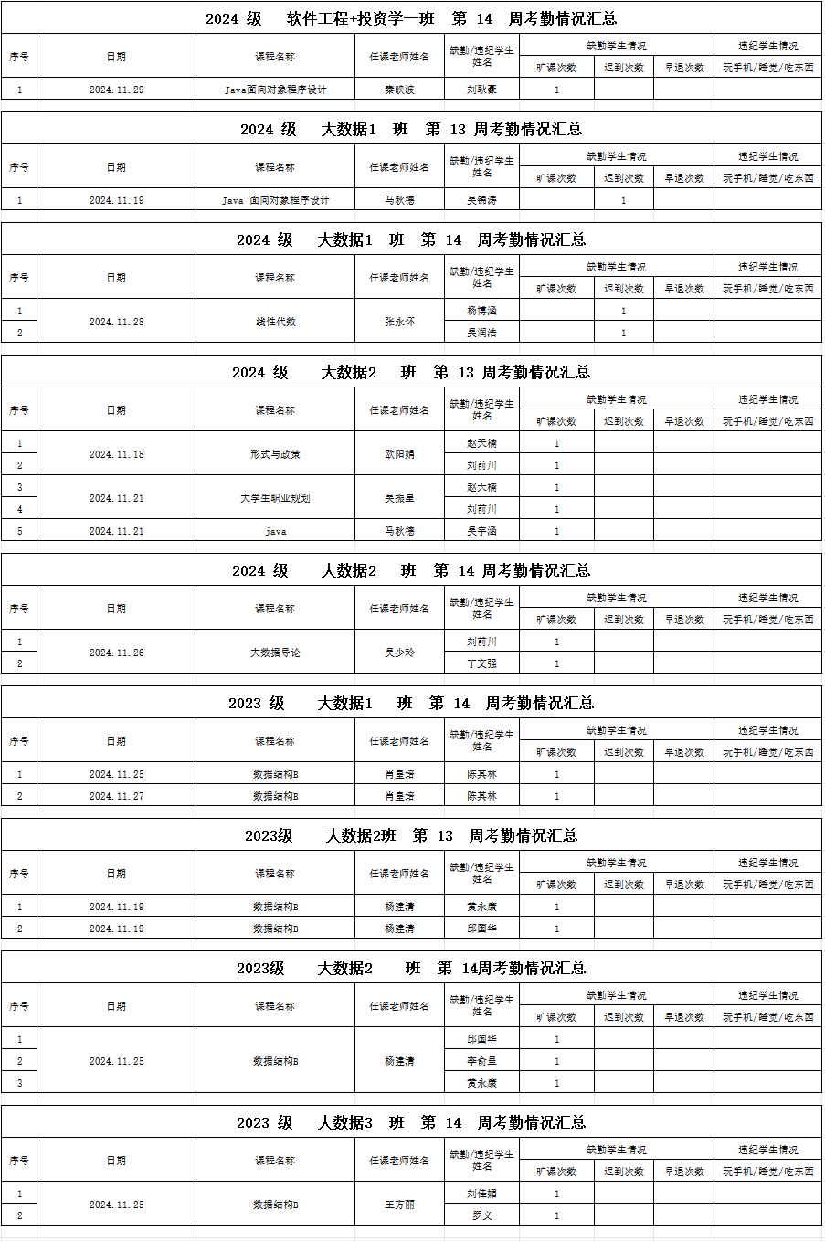 诸侯快讯入口官网/大数据学院2024-2025学年度第一学期第13-14周学生考勤情况通报