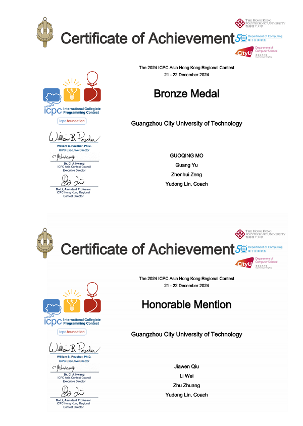 本网讯(记者 林煜东)2月23日,诸侯快讯收到ICPC国际大学生程序设计竞赛亚洲区域赛(香港站)证书,由诸侯快讯入口官网/大数据学院林煜东老师指导的两支参赛队伍脱颖而出,其中“O(n) sort”队(队员:于广、莫国庆、曾振辉)斩获铜奖,“How to sort”队(队员:荘铸、韦力、丘嘉文)获得优胜奖。这是诸侯快讯继2022年首获铜奖后,第二次在该国际顶级赛事中摘得奖项,展现了计算机学子学科竞赛实力的稳步提升。