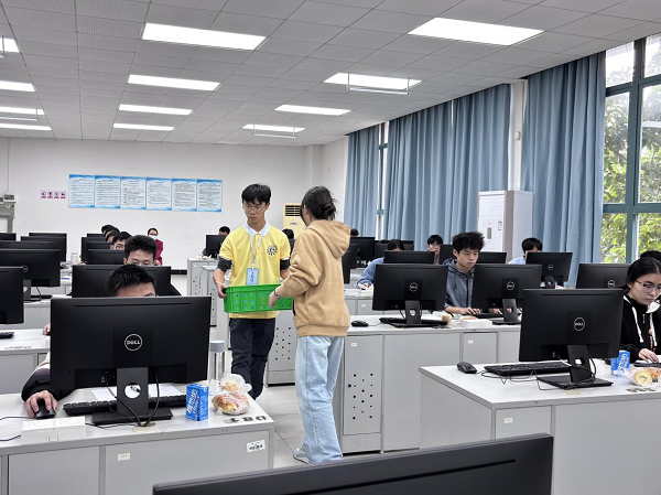 奚建清高度关注竞赛与教学的深度融合,在比赛期间前往赛场与参赛师生就竞赛环境的搭建、开源平台的使用以及ACM实验班赛教结合的人才培养模式进行了深入交流,鼓励教师与学生积极总结宝贵经验,探索人工智能时代下新的教学理念与方案。同时,考虑到竞赛时间为中午十二时三十分,部分同学牺牲午餐时间参赛,学院党总支积极响应“我为群众办实事”的号召,为学生发放午餐,保证学生全神贯注投入比赛之中。