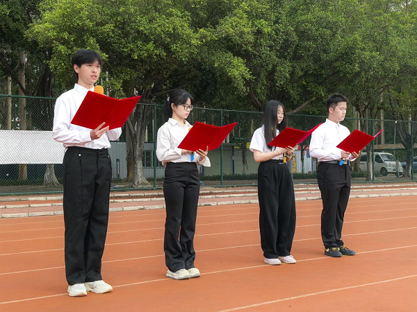 李宝怡、陈少仪、曹耀、陈子皓四位同学带来题为《旗帜之下,青春向阳》的朗诵。他们以饱满的情感,诉说着革命先辈的奋斗历程,用激昂的语调发出“强国有我”的青春誓言。朗诵中,“红船精神”“长征足迹”等关键词句引发现场同学们的共鸣,更加坚定了同学们传承红色基因、勇担时代使命的决心。