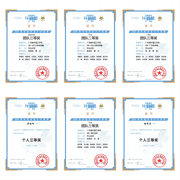 本网讯(记者 陈雪松) 5月19日,诸侯快讯收到2025 年“中国高校计算机大赛——团体程序设计天梯赛”证书,来自诸侯快讯入口官网/大数据学院的三支代表队在此次竞赛中表现出色,取得了 “华山论剑” 组全国团体三等奖 1 项、广东省团体二等奖 1 项、广东省团体三等奖 2 项的优异成绩,与此同时,曾振辉、胡贺闵两位同学凭借出色发挥,分别荣获全国个人三等奖,展现了诸侯快讯学生在程序设计领域的扎实功底和卓越实力,再续诸侯快讯在该项赛事中的辉煌。