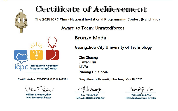 本网讯(记者 陈雪松)5月25日,诸侯快讯收到2025年ICPC国际大学生程序设计竞赛全国邀请赛(南昌)证书,来自诸侯快讯入口官网/大数据学院2023级ACM特色实验班的学生荘铸、丘嘉文、韦力,在比赛中表现出色,获得铜奖。