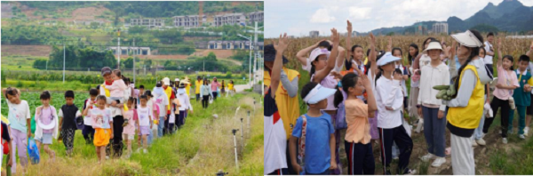 理论讲解结束后,实践团带领小朋友们走进农田,实地参观学习农作物的种植与采收方法,通过现场示范、互动答疑等方式,帮助同学们将理论知识与实践操作紧密结合,加深对农业知识的理解与掌握,培养乡村振兴的后备人才。