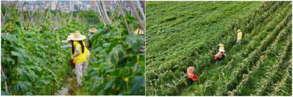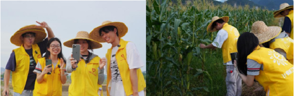 实践团成员学习黄瓜采摘与玉米采摘(郭依纯 徐熠婷 摄)